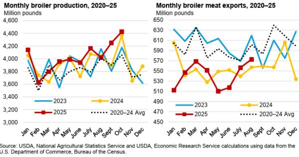 - Total live weight in August 2025 was 5,304 million lbs., down 38.7 million lbs. or 0.7 percent from October 2024;