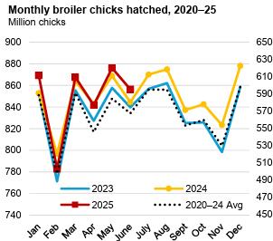 - January to August 2025 cumulative broiler hatch was 6,853 million, up 0.6 percent compared to the first eight months of 2025.