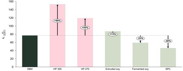 The difference in the kinetics of protein digestion and subsequent absorption of constituent amino acids among conventional feed-grade soybean meal and alternative protein sources demonstrates the beneficial effects of enzymatic processing under controlled mild heat. It is evident from the following figure that HP AviStart is absorbed at a faster rate than conventional soybean meal characterizing the product as a “fast protein”.