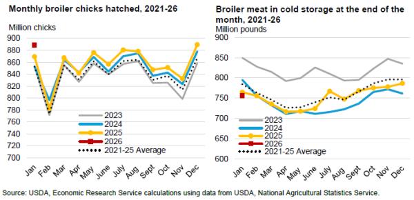 - Total Chicken category attained 780.1 million lbs. (353,798 metric tons) corresponding to approximately one week of production based on recent weekly RTC output. The February 28th 2026 inventory was down 1.7 percent compared to 793,487 million lbs. (359,858 metric tons) on February 28th 2025 and down 0.5 percent from the previous month of January 2026.