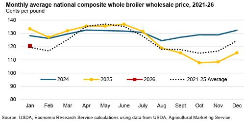 - Unit live weight in February 2026 was 6.68 lbs., up 0.11lb. (1.7 percent) from February 2025.