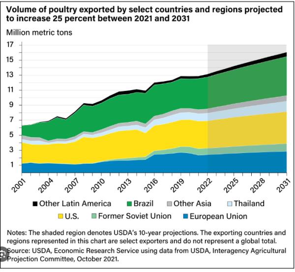 The U.S. broiler industry relies on the annual revenue amounting to $4.5 billion from the export of undifferentiated leg quarters representing 14 percent of RTC production. Dark meat at a lower cost compared to the front half of the bird could be blended with white meat to produce a product suitable for QSRs and acceptable to consumers. As has previously been stated, the U.S. cannot rely on continued growth or even stability in export volume and value, given the challenges of competition from Brazil, increased domestic production by importing nations, restrictions over avian influenza, tariff disputes and geopolitical considerations These factors together with rising transport costs are making the U.S. less competitive.