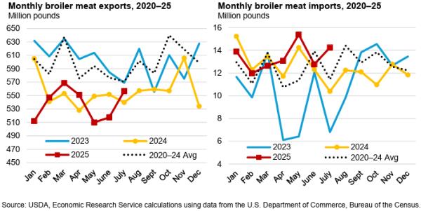 Total broiler parts, predominantly leg quarters but including feet, exported during January-July 2025 compared with the corresponding months in 2024 declined by 7.0 percent in volume but value was up 0.5 percent. Unit value was 8.0 percent higher to $1,501 per metric ton.